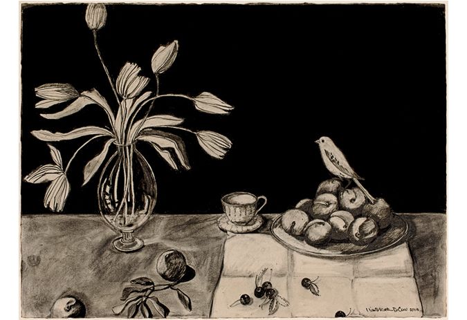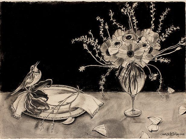 I am particularly inspired by textile patterns and influenced by Asian art. My drawings are more traditional still lives with surreal under tones. They are charcoal on heavy cream colored paper. I am open to commissions, and my newest work is shown at cultureclash gallery on F street.