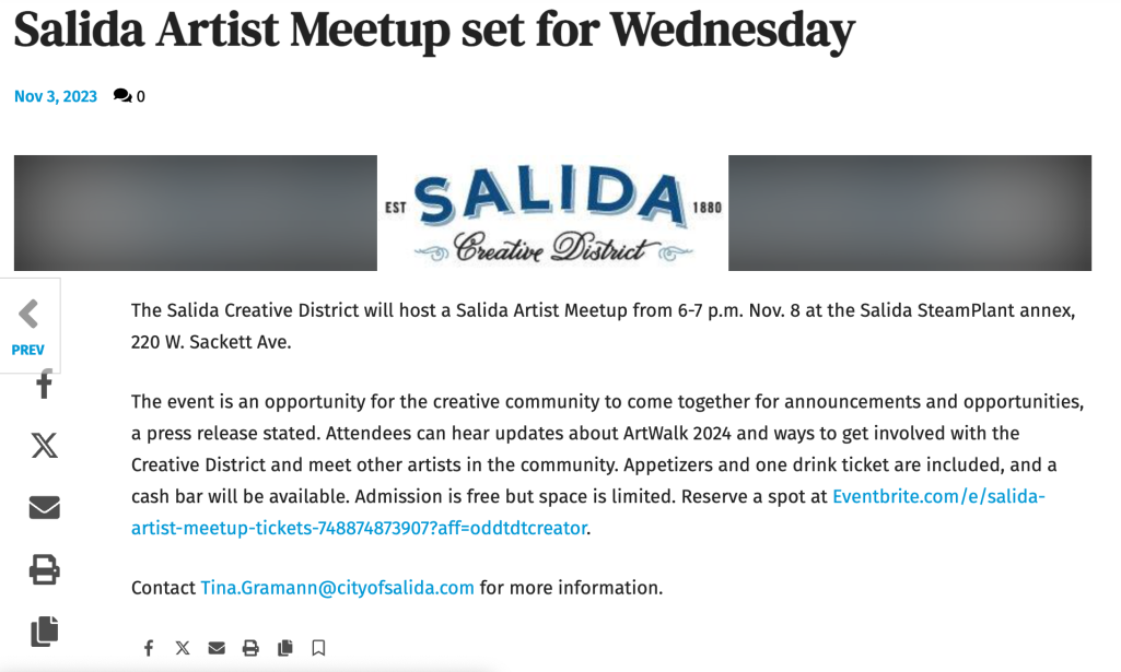 SALIDA ARTIST MEETUP SET FOR WEDNESDAY